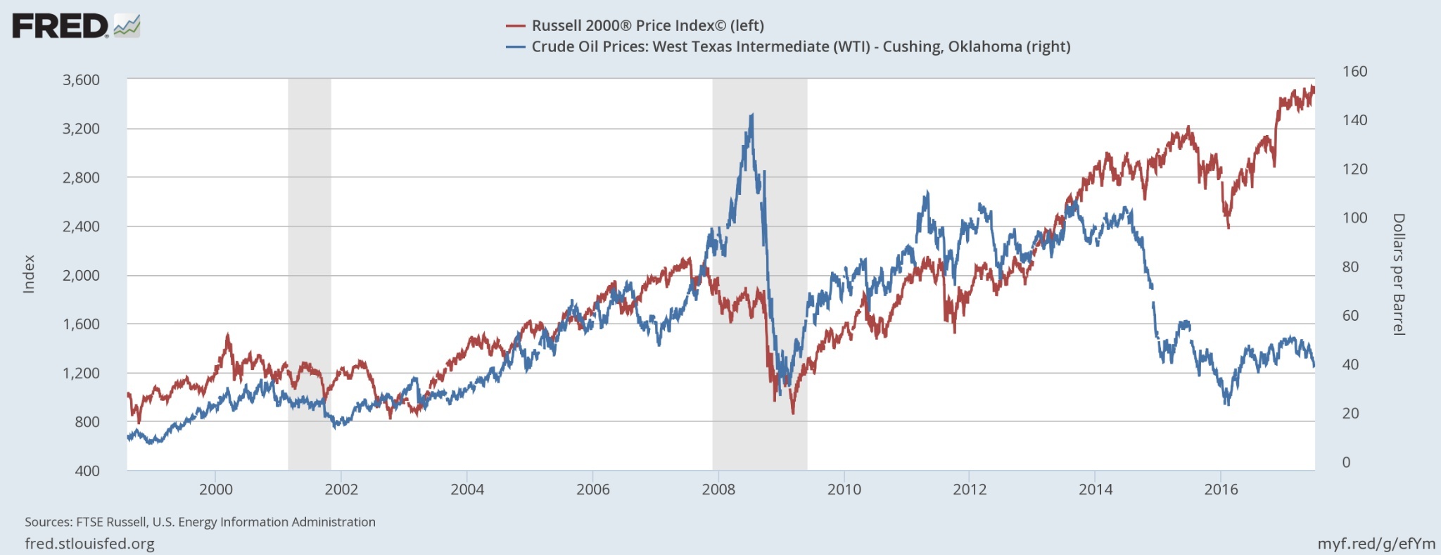 红色:罗素2000指数(左轴) 蓝色:WTI原油价格(右轴) 数据来源:美联储