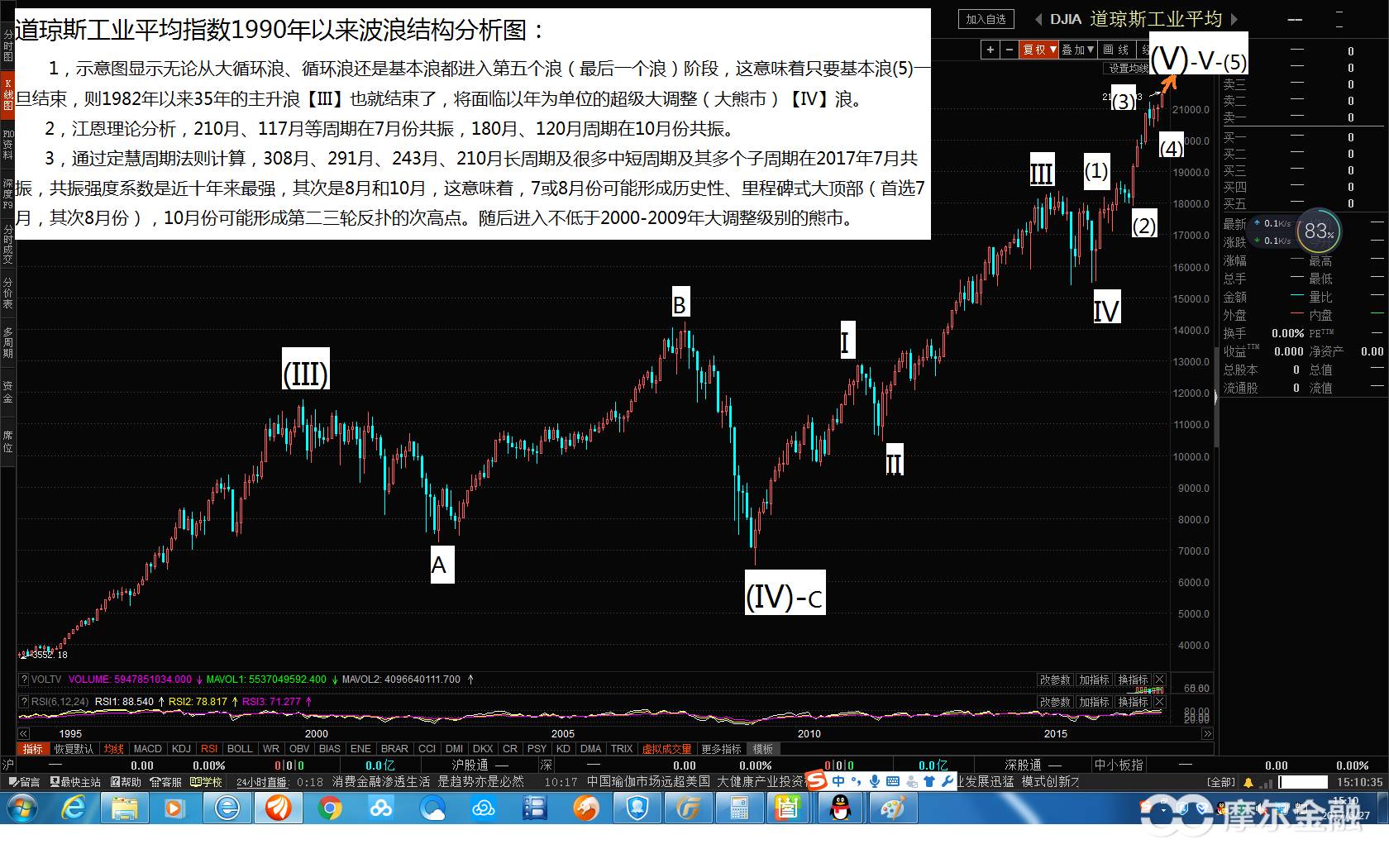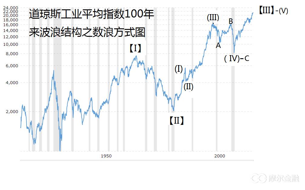 [摘要] 无论从大循环浪、循环浪还是基本浪看,道指都进入了第五个浪(主升浪的最后一阶段),这意味着只要基本浪(5)一旦结束,则起自1982年的35年超级主升浪【III】也同时结束了,将进入以年为单位的超级大调整(大熊市)【IV】浪。