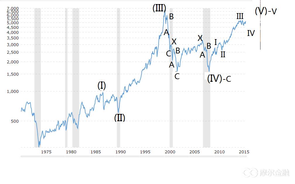 1,纳斯达克指数与道指一致,一旦(5)浪结束,就意味着起自1974年的更高级的循环浪、大循环浪结束,运行了43年的超大循环【III】浪结束,从而进入以年为单位的、与2000-2009年大调整同级别甚至更高级的大调整浪【IV】浪。