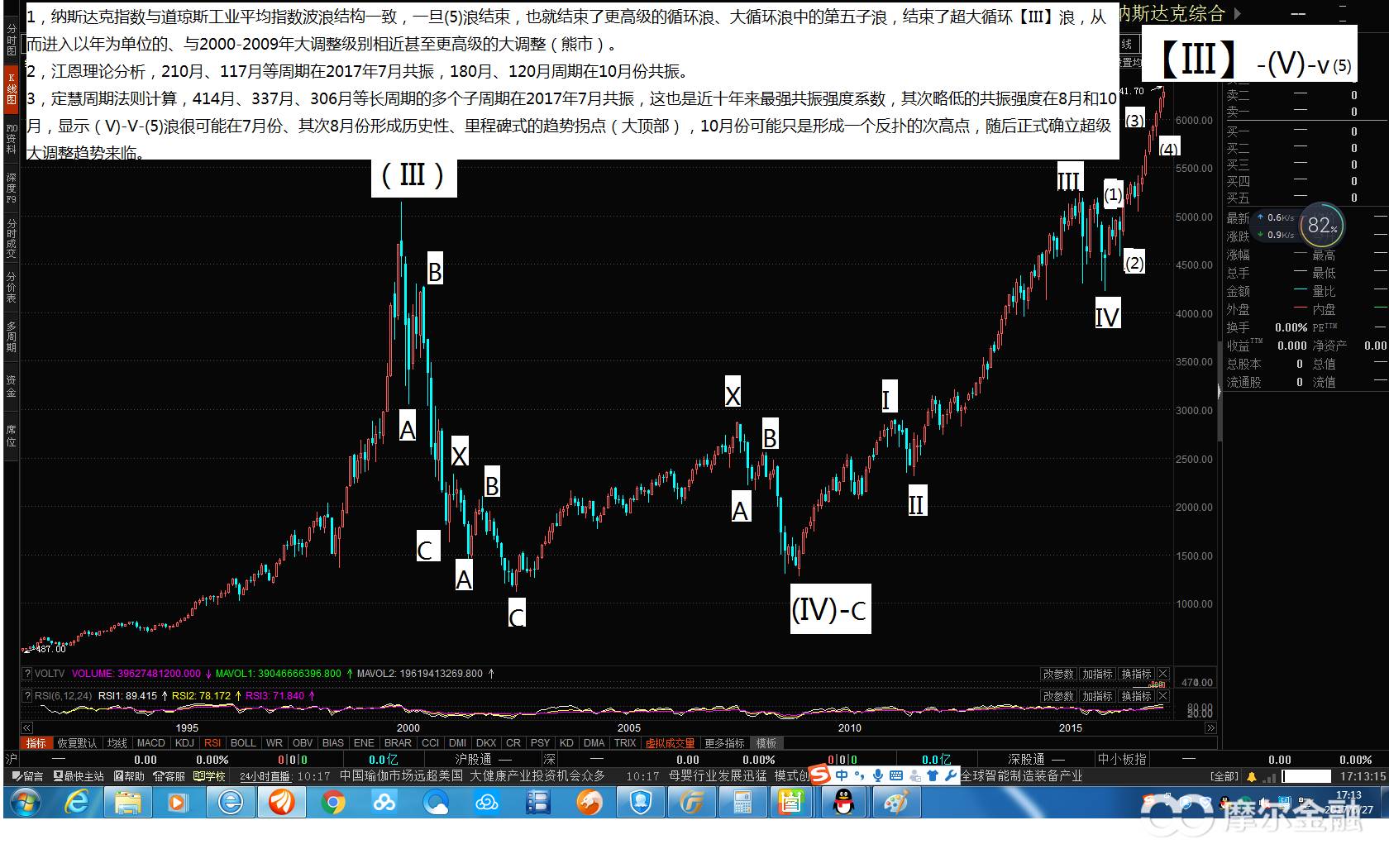3,通过定慧周期法则计算,414月、337月、306月等长周期和一些中短周期及其子周期在2017年7月共振,共振强度系数是近十年来最强,其次略低共振强度的是8月和10月,技术上的结论是,7或8月份可能形成历史性、里程碑式趋势大拐点、大顶部(首选7月末之前,次选8月),10月份可能形成的是第二或三次反扑的次高点顶部,随后正式确立进入2000-2009年同级别甚至更高级别的超级调整浪【IV】。