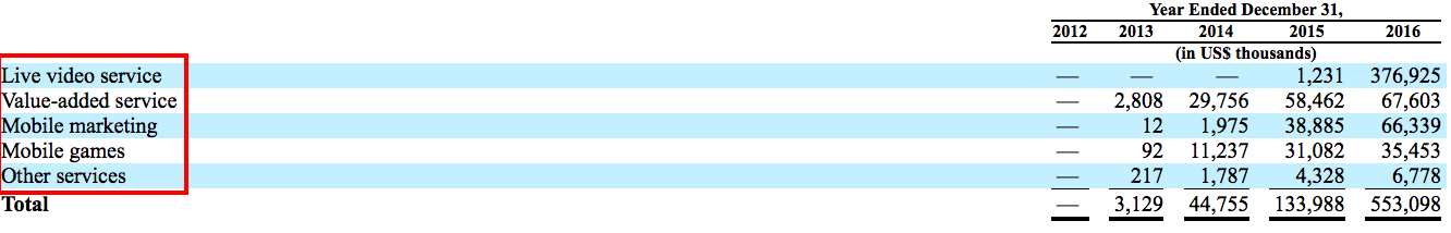 陌陌的收入构成是直播业务、增值服务、移动营销(广告)、游戏业务。从图表可以看出,直播业务之前增值服务是陌陌在2013年到2015年之间的主要营收来源,2015年有5846万美元的增值业务收入,而那个时候,陌陌的月活用户是6980万。