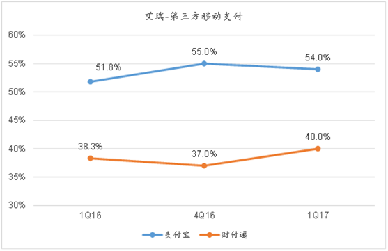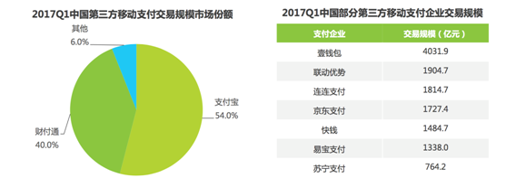 6月30日由咨询公司艾瑞(iResearch)公布的数据显示,2017年第一季度中国第三方移动支付交易市场中,支付宝市场份额同比增长2.2%至54%。紧随其后的腾讯旗下财付通,交易市场份额同比增长1.7%至40%。