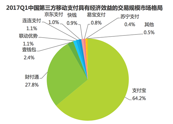 从去年四季度以来,艾瑞开始对有经济效益的交易规模进行了统计,在最新公布的报告中,2017Q1,中国第三方移动支付交易规模为22.7万亿元,其中具有经济效益的交易规模为16.8万亿元,支付宝的市场份额占比最大,达到了64.2%,财付通次之,占比27.8%。