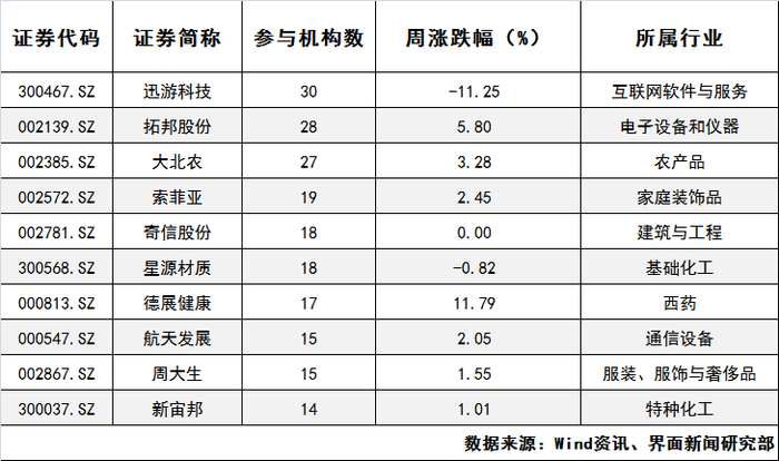在本周众多获机构调研的上市公司中,迅游科技(300467.SZ)、拓邦股份、大北农(002385.SZ)的调研热度最高,其获调研机构数量分别为30家、28家、27家。从机构参与调研的频次来看,机构们本周主要集中在6月27日扎堆进行调研。这天,沪指在前一个交易日创下本周最大单日涨幅后并于当日继续攀升,剑指3200点位,市场氛围由此较为热烈。