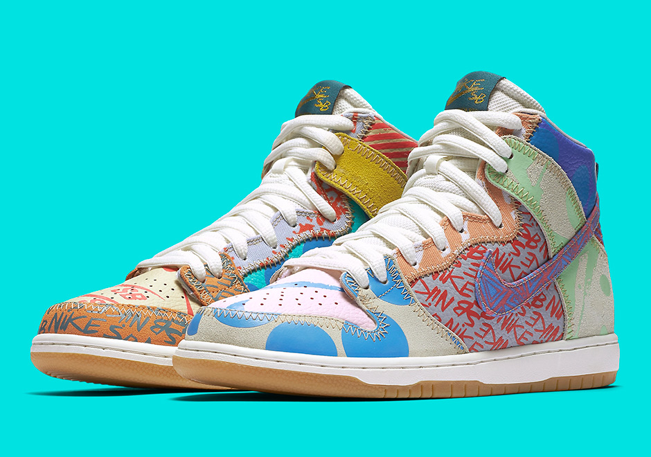 Nike SB自2007年发售“WHAT THE”系列开始,便尝试将多元的颜色、材质、图案缝合在一起的设计。而这次耐克滑板鞋款又重新采用了该设计,并且将品牌名称与新的图案缝合在了鞋上,十分亮眼。