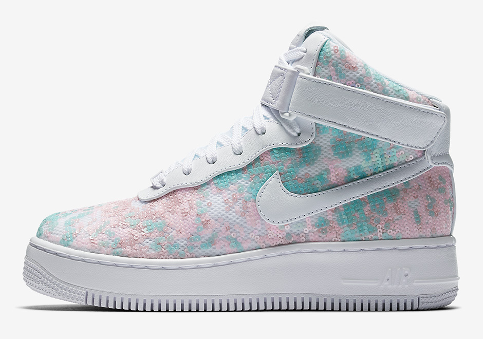 专为女性打造的AIR FORCE 1高帮鞋推出属于夏季的款式,透明的鞋身上点缀以蓝色、粉色金属亮片,鞋带与脚踝也增添了皮革细节。