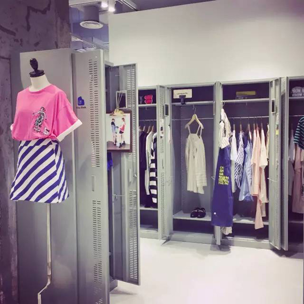 Fred Perry的Polo衫和小白鞋带顾客进入了“校园课堂”,课桌成了陈列架,而旁边还有学校里常见的储物柜。