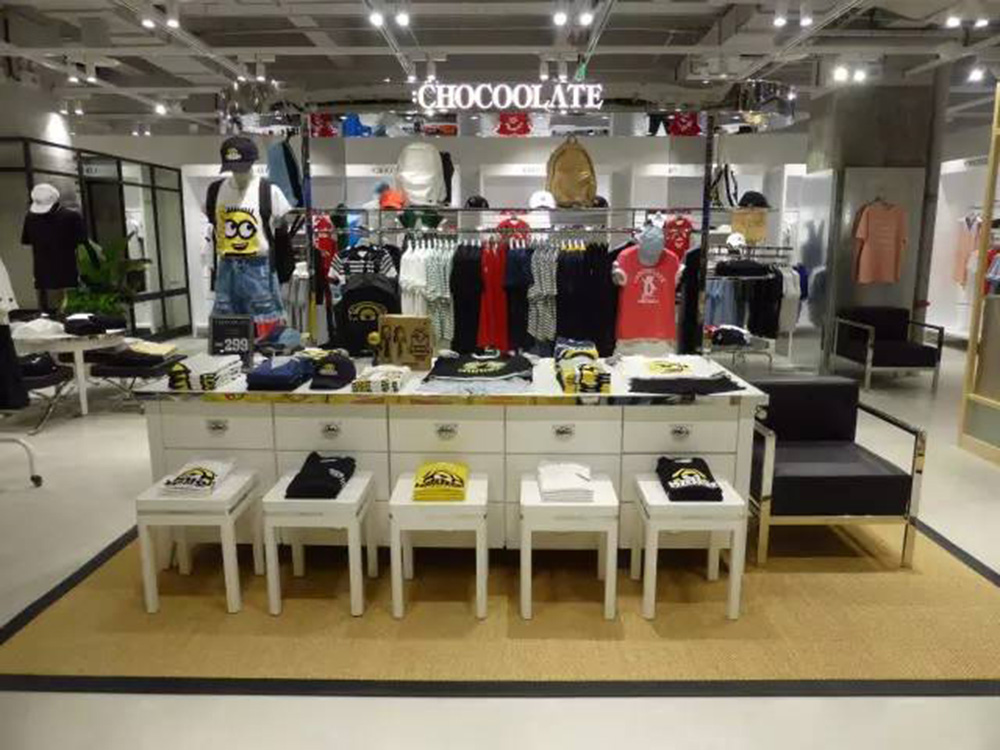 i.t旗下的两大主力品牌也以最经典的装潢在旗舰店中再现。AAPE沿用了经典的moonface logo,橱窗依旧是变换的霓虹灯管。而CHOCOOLATE在原本黑白巧克力砖块的设计上加入了水管元素,营造出工业风的氛围。
