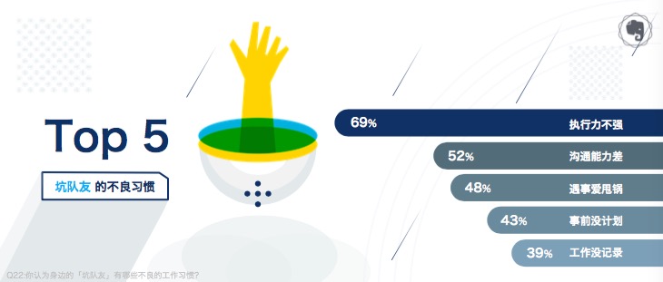 执行力不强成为超半数知识工作者最难以接受的工作伙伴特征。相比工作没记录、事前没计划等缺点,知识工作者对于执行力不强的忍耐力最低,69%的受访者都把票投给了这一项。