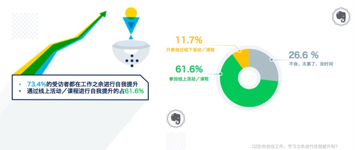73.4%的受访者正在或曾经进行过自我提升,其中参加过线上活动的占61.6%,而读书这个习惯和自我提升习惯正相关。