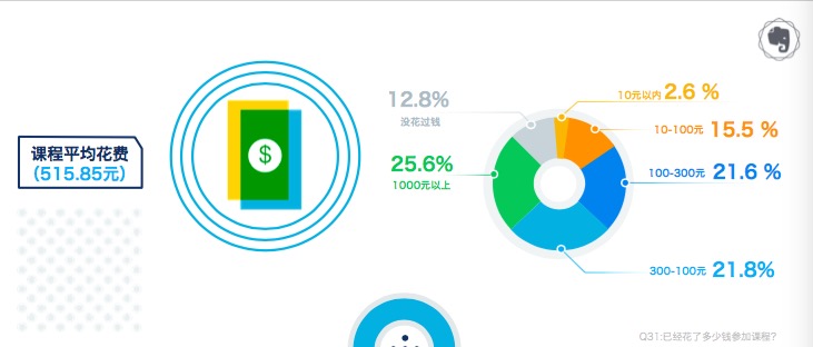 在学习课程付费方面,受访者的平均花费为516元,在付费的受访者中,往往花费越高,对所付费课程的评价也越高。