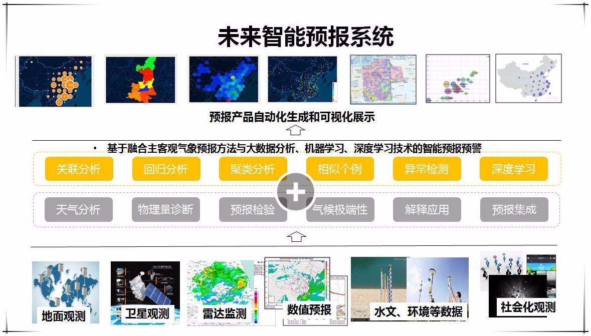 未来,气象部门还将发展结合物理机理与数值预报大数据挖掘应用的智能预报技术。一方面,基于数值预报机理的数理统计形成复杂预报模型、预报方法;另一方面,基于大数据技术的数据挖掘、机器学习等方法,研究深度学习预报模型或预报机器人。有人可能会问,如果完全基于机器学习和人工智能,那未来智能预报该怎么做呢?