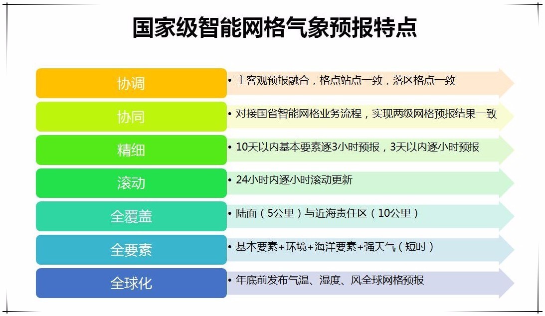 在这场过程中,我们不难发现,天气预报是准确的,但天气预报与公众的需求并没有完全契合,有的地方下雨了,有的地方还没下。如何与公众需求相契合就是智能网格预报业务要解决的问题。智能网格预报的初步目标是把全国分成5公里×5公里的网格,在这个基础上每隔1小时更新一次预报,如果遇到重大天气过程,更新的频率还会加快。