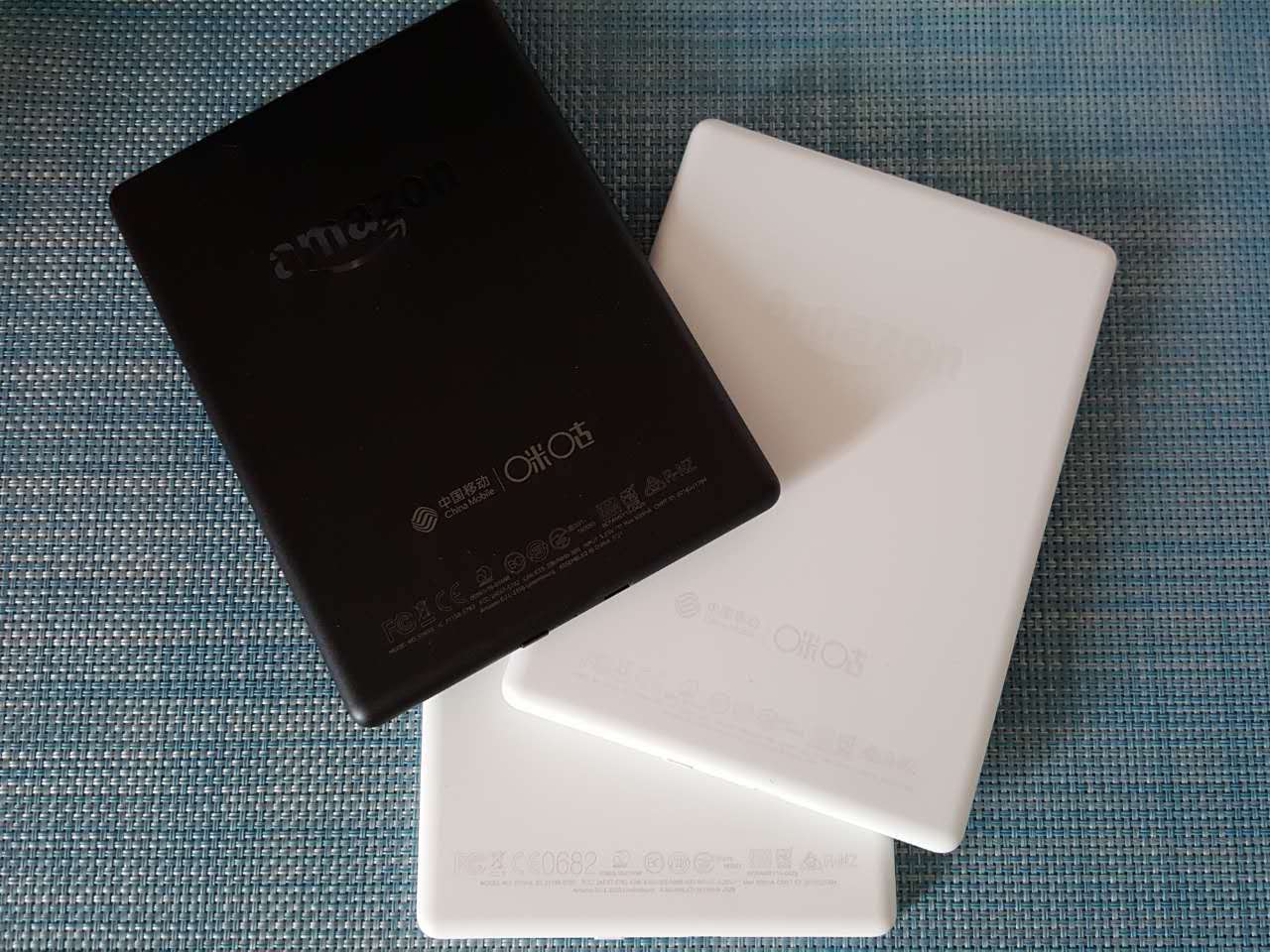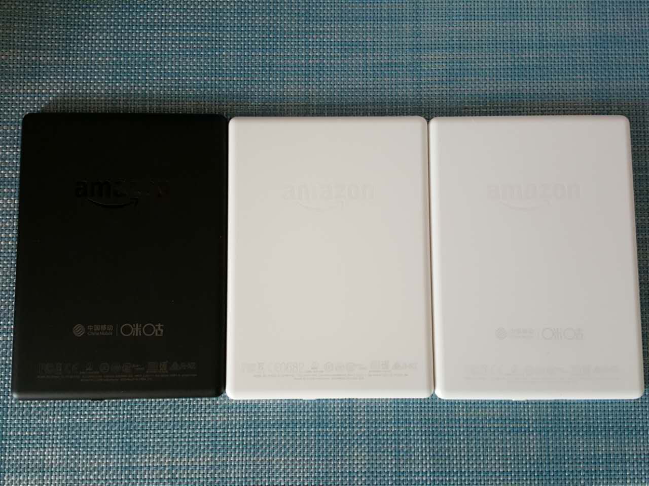 黑色、白色各一款,外观上和此前的Kindle入门版(中间)没有区别,只是在后背多了“中国移动+咪咕”的标志。