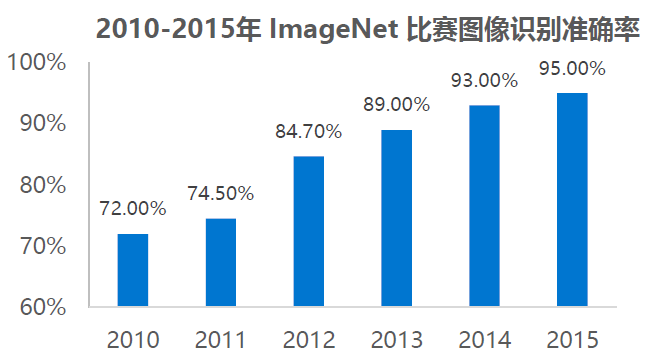 深度学习出现之后,计算机视觉的主要识别方式发生重大转变,自学习状态成为视觉识别主流。机器从海量数据库里自行归纳物体特征,然后按照该特征规律识别物体。图像识别的精准度也得到极大的提升,从70%提升到95%。