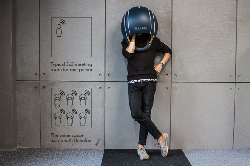 比起降噪耳机,helmfon 头盔能更彻底地隔绝外部噪音,而且头盔的设计让使用者的视线也只能集中到眼前的电脑上,从而更能专注于眼前的工作。