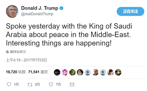 特朗普本人也于周一发Twitter称与沙特国王就“中东地区的和平”进行了对话,“有趣的事正在发生”。