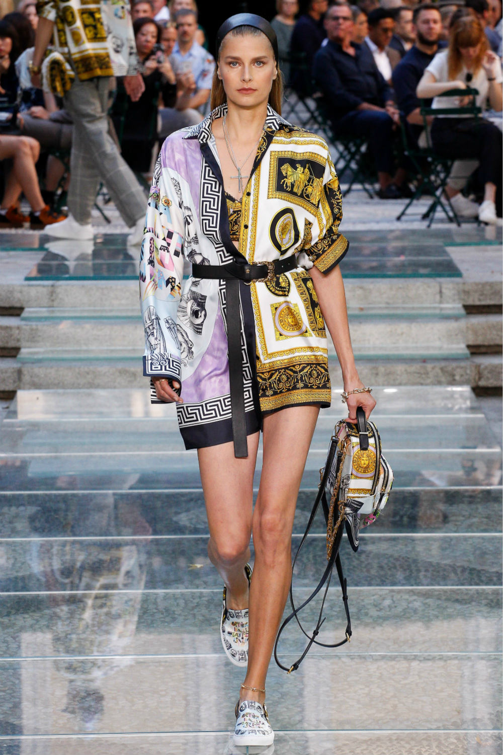 两周以前的2018春夏米兰男装周上,Versace回归品牌总部,在米兰Palazzo Versace举办了最新发布会。时间节点适逢创始人Gianni Versace逝世20周年,宽版条纹西装、休闲短裤、标志性的图腾丝巾......一切仿佛都回到了30多年前Versace的黄金岁月。