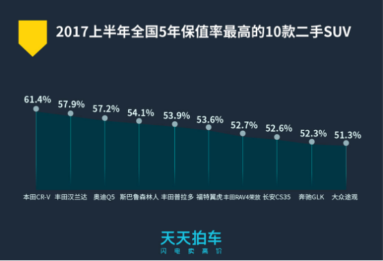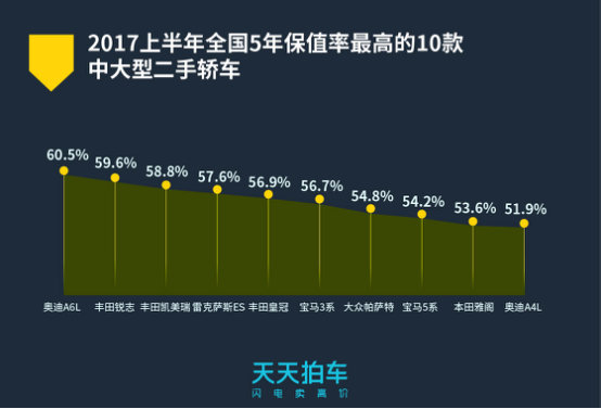 从保值率来看,不管是轿车还是SUV,日系车在二手车保值率方面呈现出绝对优势,本田CRV、丰田汉兰达、丰田锐志等5款日系车型分别领跑二手SUV及中大型二手轿车保值率TOP10榜单。在小型二手轿车保值率方面,德系大众和日系车平分天下;在中大型二手车轿车保值率排行中,奥迪A6L位列保值率榜首。