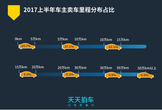 从行驶里程来看,61.8%的二手车行驶里程在10万公里以内卖掉,另有31.5%的二手车行驶里程在10万-20万公里卖掉。此外,统计数据显示,二手车卖车量与行驶里程数呈反向递减规律,即行驶里程数越高卖车量越少。