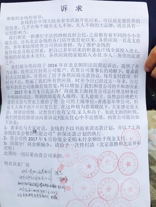其中一名供应商告诉界面新闻,但这份协议只执行了一两个月就不执行了。一名供应商透露,在关门之前,金钱豹餐厅的月流水仅有百万元甚至不到,而2008年左右一家店最高可达到上千万元的月流水。但即便是百万元的流水,也到不了供应商的口袋里,7月4日,北京金钱豹翠微店门口仍然有供应商聚会维权。