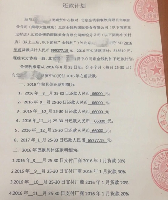 北京两位不愿具名的供应商向界面新闻提供了此前金钱豹公司写给供应商的还款协议,该协议由北京金钱豹餐饮有限公司出具,列出了从2016年8月至2017年1月的还款明细,并加盖公章。