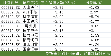 基建板块的部分个股则遭遇主力大幅抛售。天山股份(000877.SZ)、中国建筑(601668.SZ)葛洲坝(600068.SZ)等个股主力净流出额位居两市前列,分别为3.91亿元、2.85亿元、2.49亿元。