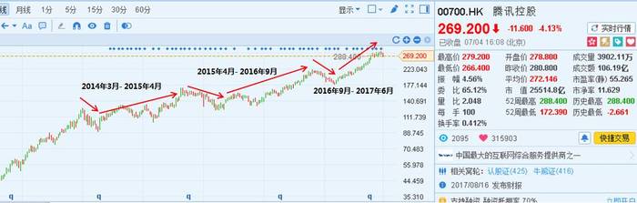 不妨看看过往3年腾讯股价每次下跌后反弹的表现。当中我将它分为三段时期: