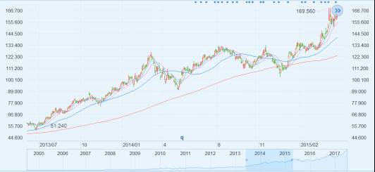 第三段:股价由2016年9月开始下跌约18%,其后于2016年12月反弹,升势直到2017年6月底,反弹幅度约61%。