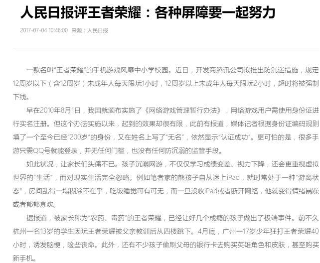 近来,王者荣耀的负面新闻渐渐多了起来。特别是人民网点名批评了王者荣耀,质疑其游戏运营商未能有效进行玩家年龄身份识别,导致青少年沉迷这款游戏,甚至有一些案例形成比较极端的后果。