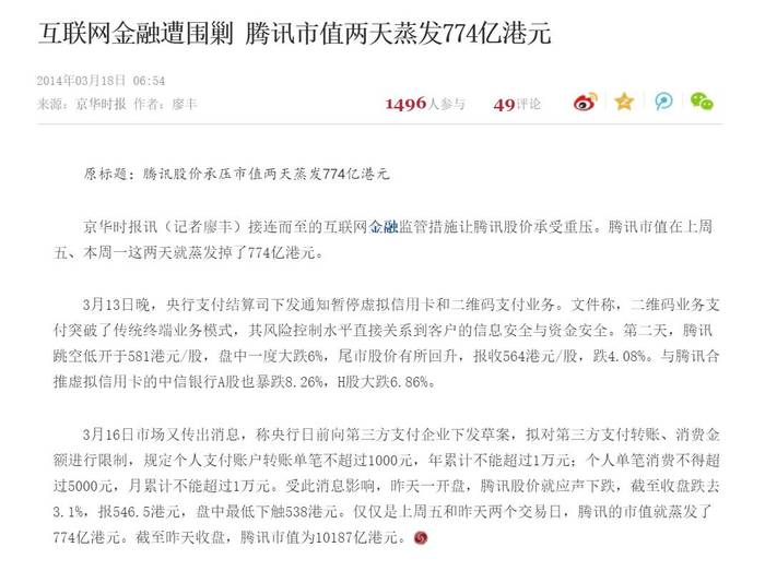 可能这次事件对腾讯的管理层带来一些特别的思考,在腾讯的“两个半平台战略”中,金融定位为半个平台,仅做技术层面的东西,而并未深入向传统金融业拓展,相信大方向定位体现了腾讯管理层的智慧。