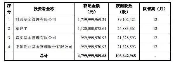 认购方为财通基金、章建平、嘉实基金、中邮创业,认购金额分别为17.6亿元、11.2亿元9.6亿元和9.6亿元。限售期12个月,预计2017年8月8日上市流通。