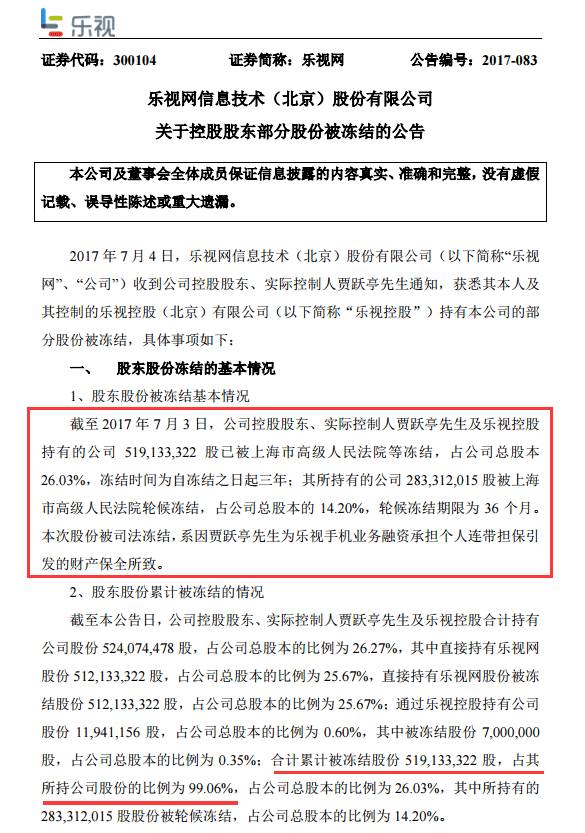 公告显示,截至7月4日,乐视网控股股东、实际控制人贾跃亭及乐视控股合计持有公司股份5.24亿股,占公司总股本的比例为26.27%,合计累计被冻结股份5.19亿股,占贾跃亭所持乐视网股份的比例为99.06%,这也意味着贾跃亭持有股份几乎全部被冻结了。