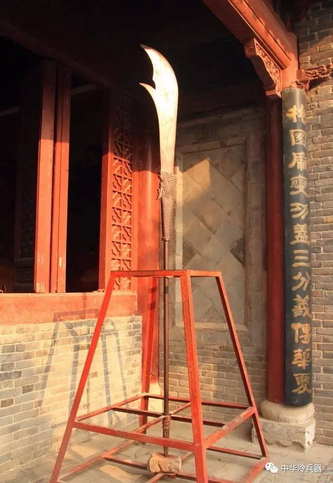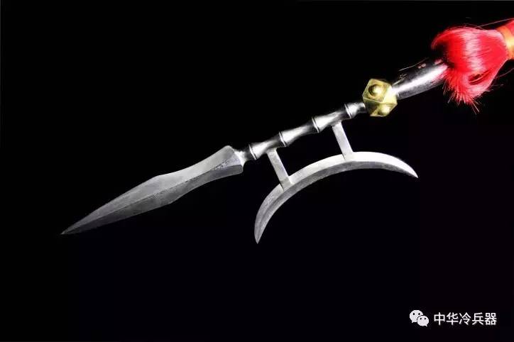 青龙戟(戟刀):单月牙,长杆兵器。刀尖长四寸,边锋长一尺,全长五尺左右。刀柄粗可盈握,柄尾有一三棱形铁鐏。