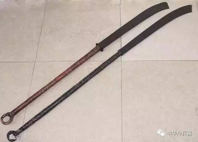 雁翅刀:也是因形得名,但是也有人说是因刀身带环,挥舞似大雁振翅。特点是刀刃短于刀背,类似于砍刀。刀背厚,刀头宽大,刀体重。刀头有类似大雁翅膀一样的波浪形状。