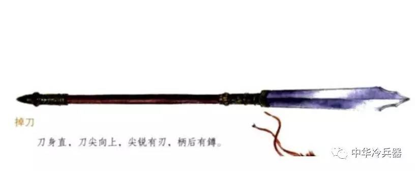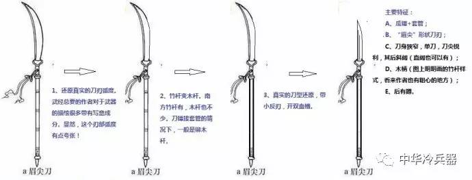眉尖刀 :宋刀八色之一,长杆兵器,刀条修长微弯似眉毛的形状。日本的薙刀与之极为相似。