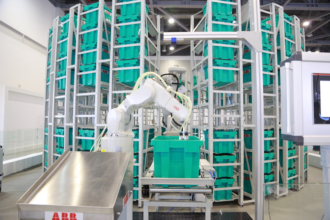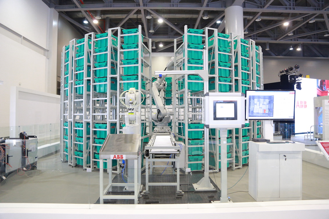 在本届活动上,ABB也展出了关于物流仓储的新型机器人——“小型机器人(IRB1200)+大型机器人(IRB6700)”的组合应用。大机器人负责从上层传送带提取料箱,按照指令存入货架相应位置,小机器人借助3D视觉辅助,拾取箱中物品并放置在下道工序的传送带上。