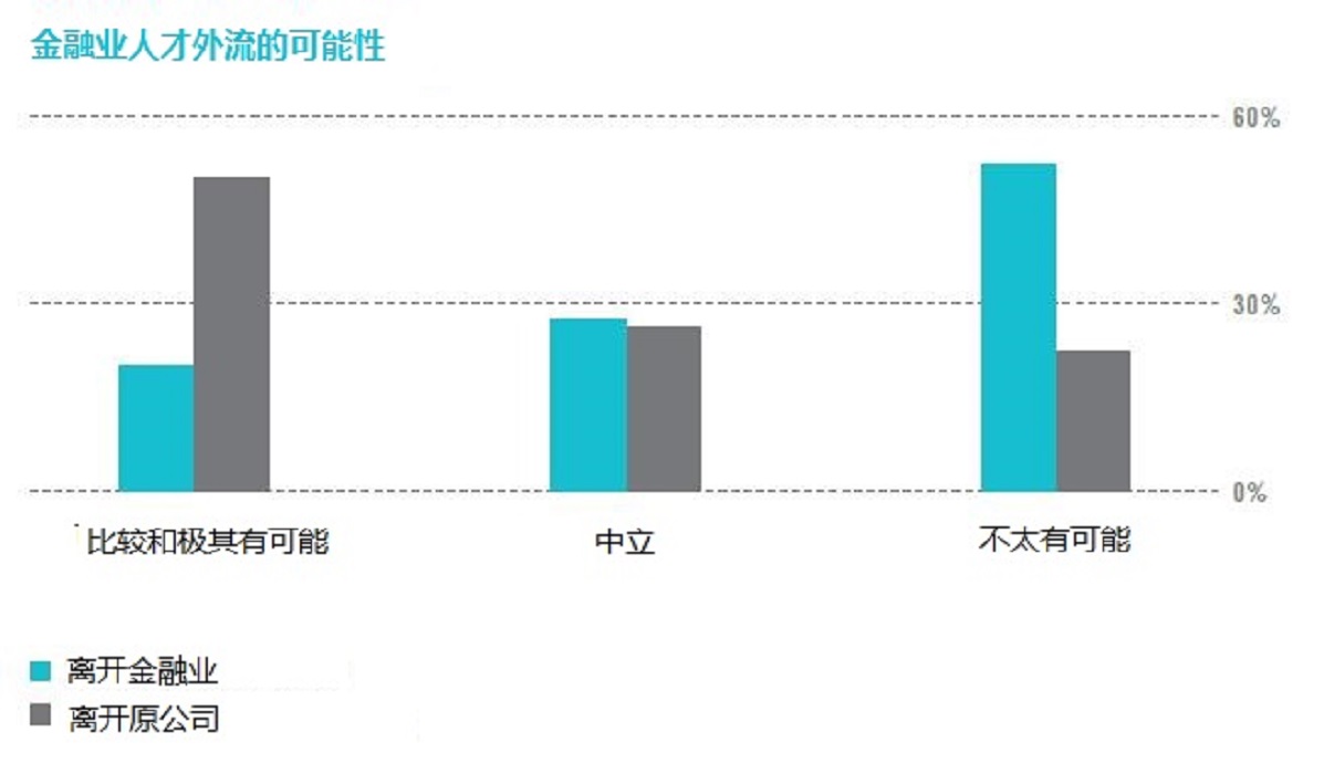对于那50%打算继续留在金融业的人们,考虑一下这些问题:公司能如何找到这些忠诚的员工?团队里应如何加强他们的向心力?对于30%持中立态度的人,这些人的立场因为不坚定而最为脆弱。了解一下,公司的管理层是否已在队伍中进行足够互动,知道这些人是谁?