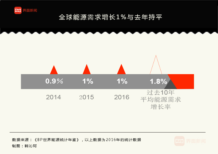 2016年,全球的能源需求仅增长1%,连续第三年保持疲软态势,与去年持平。约为过去十年平均增长率的一半。能源需求约一半的增长量来自中国和印度。