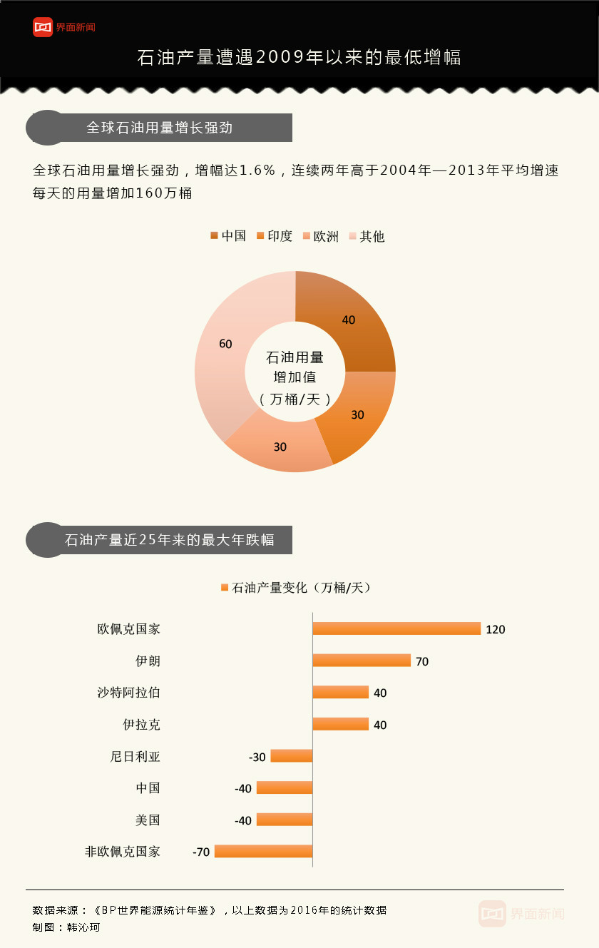 2016年全球仅增长石油产量40万桶/天,同比增长0.5%,是2009年以来的最低增幅。