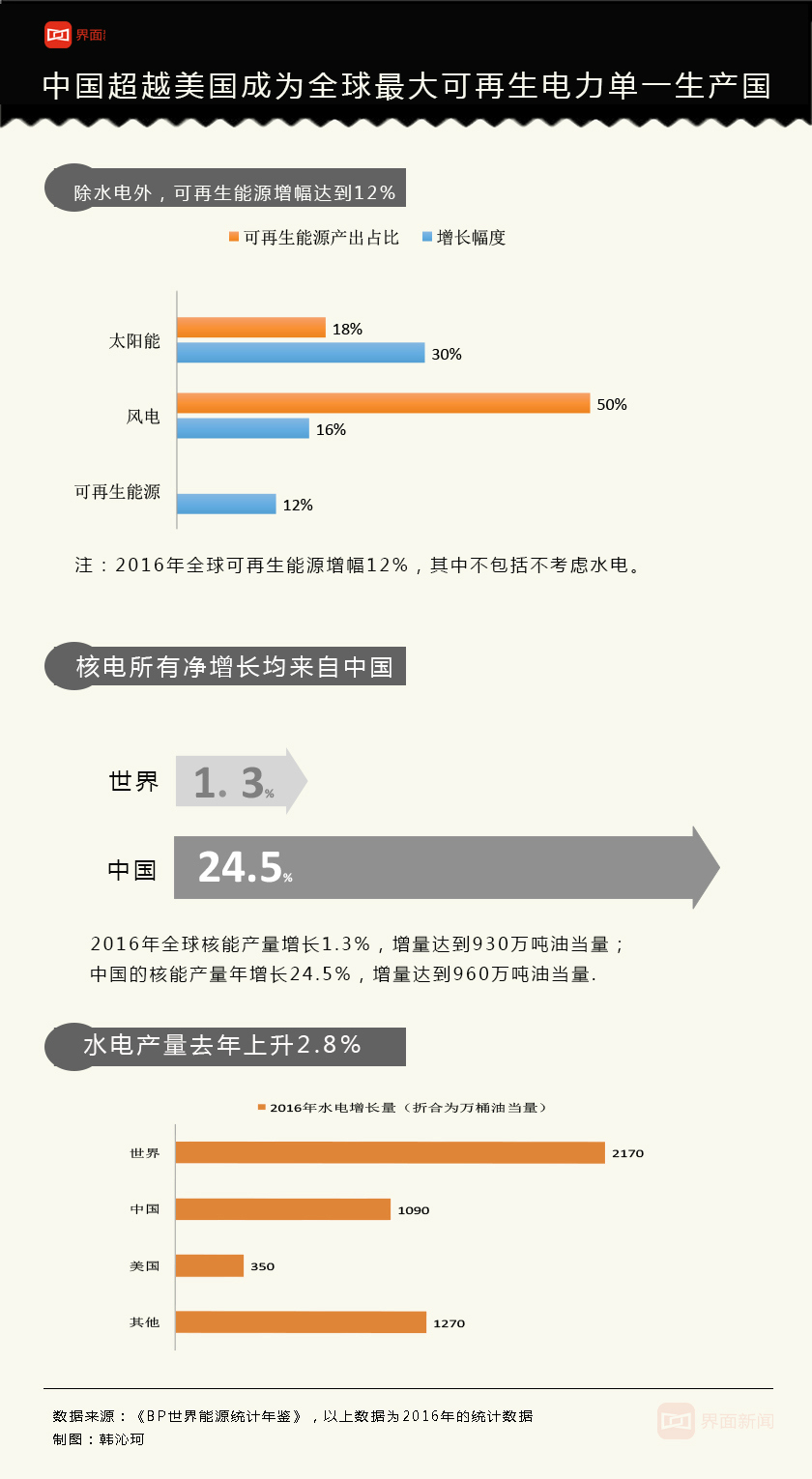 核能部分,核电所有净增长均来自中国,2016创2004年以来(相比于任一国家)的最大增量。