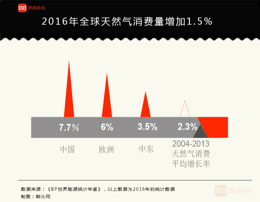 2016年全球天然气产量仅增长0.3%,除2008年金融危机外,这是34年以来产量增长最低的一年。