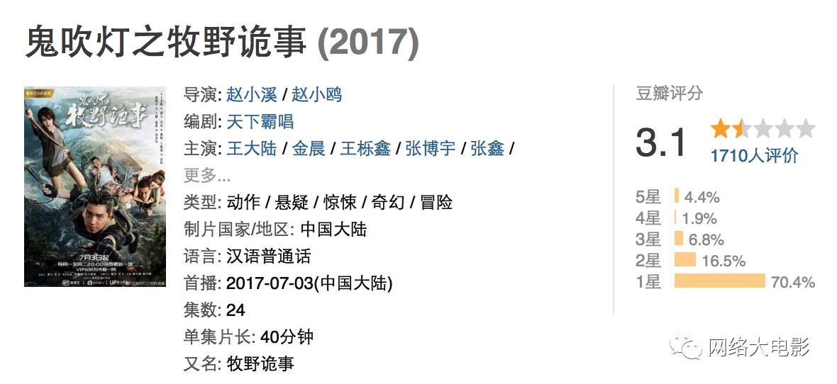 《鬼吹灯之牧野诡事》豆瓣评分只有3.1,可以说是恶评如潮,评分有望创历史新低,直追黄磊老师的《深夜食堂》,豆瓣70%的人只给了1星。