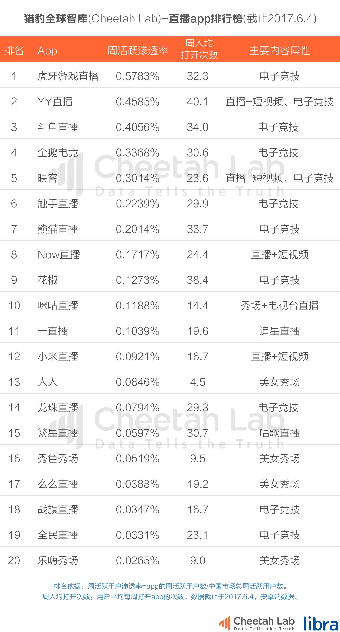 注:体育直播、纯电视直播以及划分到短视频领域(详情请见猎豹全球智库(Cheetah Lab)的短视频报告)的app不包括在排行榜中。