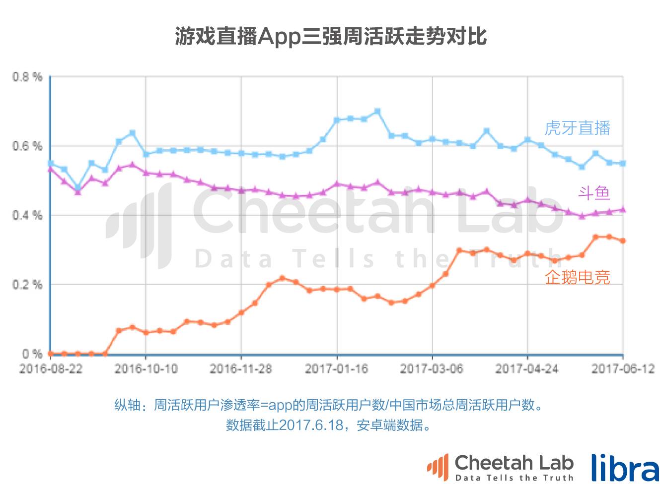 从国内市场看,虎牙、斗鱼两个领先的游戏直播app发展趋势更为稳健,而企鹅电竞作为王者荣耀官方直播app,不到一年时间已经飙升到游戏直播前三。企鹅电竞是腾讯自家的产品,斗鱼有腾讯的投资,不知不觉中,腾讯已经收割了游戏直播三强中两个席位。