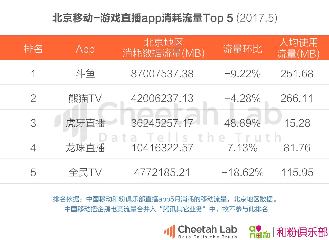 游戏直播app的主打内容、社区氛围各不相同,也体现在流量消耗情况上。根据中国移动和粉俱乐部提供的北京地区人均手机流量使用情况,斗鱼、熊猫直播的人均使用流量极高,龙珠直播、全民直播的流量次之,而它们都大幅度超过了用户基数最大的虎牙直播。从这个角度来看,直播排行榜老大的位置同样还是一个悬念。