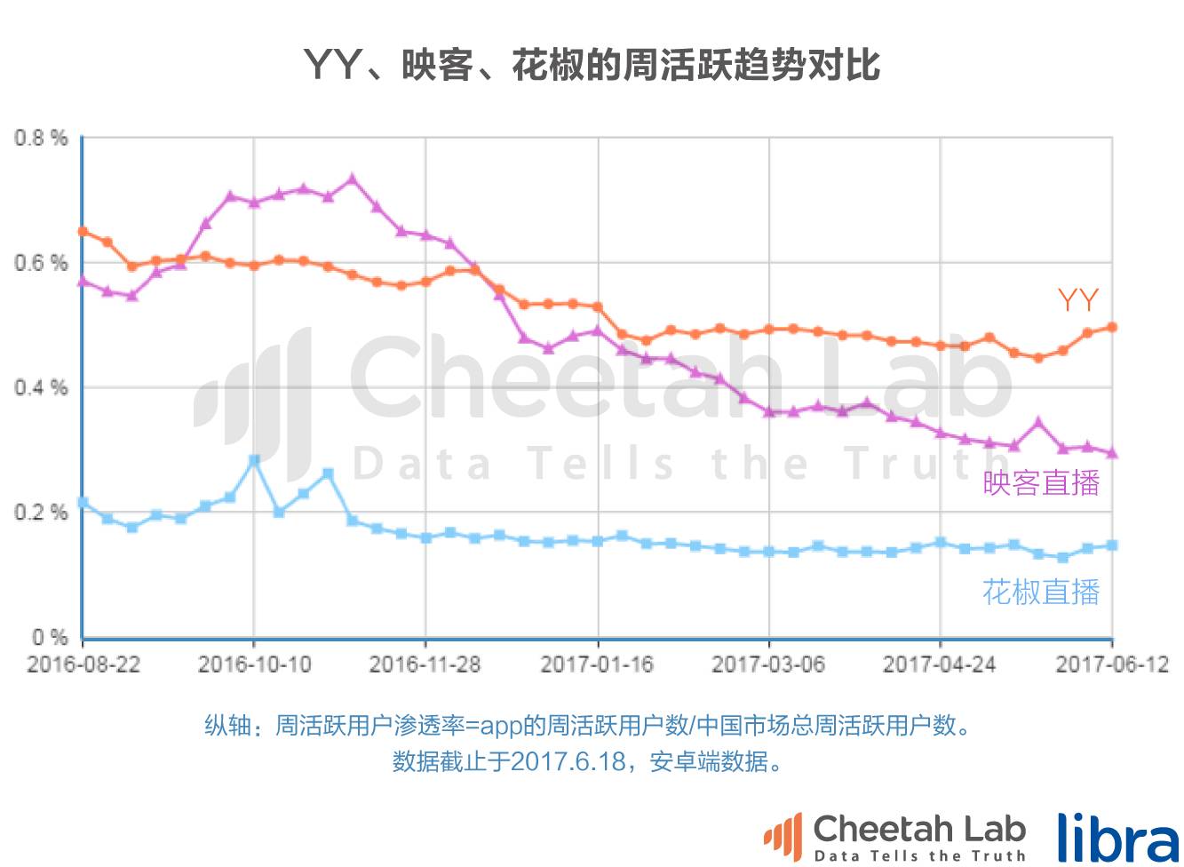 YY、映客、花椒是泛娱乐直播的代表,其中YY更偏向秀场,而映客、花椒综合性更强。根据猎豹移动app大数据平台libra的数据,从去年8月开始,映客大起大落,YY、花椒也都呈现下降趋势:这从一定程度上也代表了2016兴起的直播泡沫渐渐破灭、直播行业大洗牌的状况。