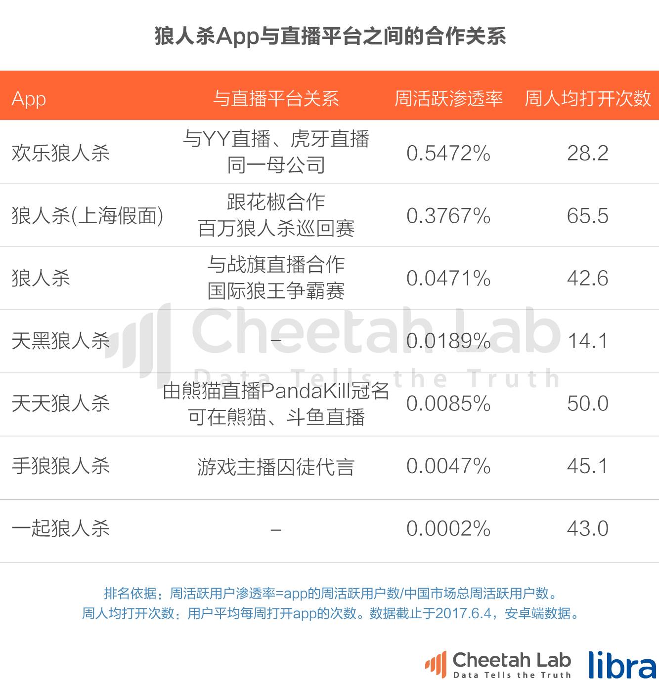 目前,综艺、直播、桌游背景的公司纷纷布局狼人杀,libra能监测到的狼人杀app已经有7个,与直播平台的合作十分密切。