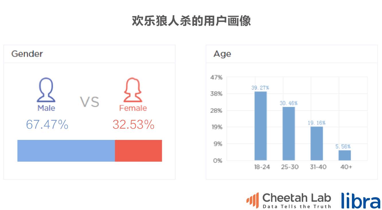 从欢乐狼人杀的用户画像可以看见,狼人杀的玩家中年轻用户多,与直播app的契合度较高,但女性用户比直播app更多。