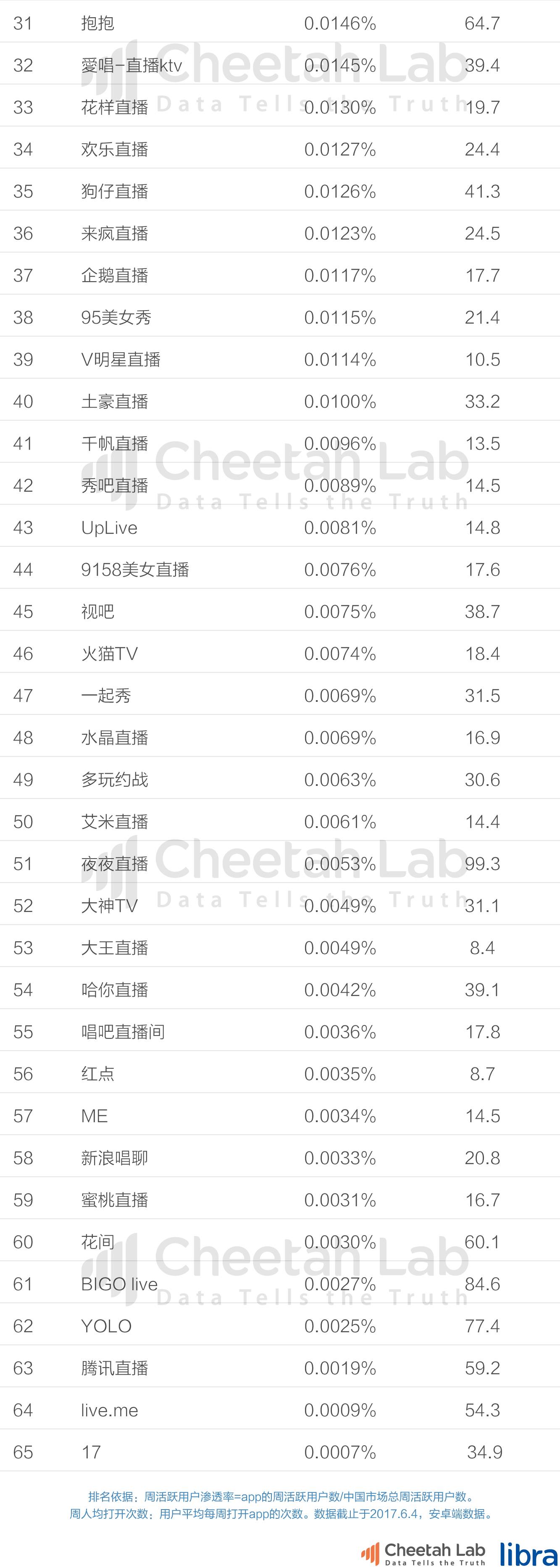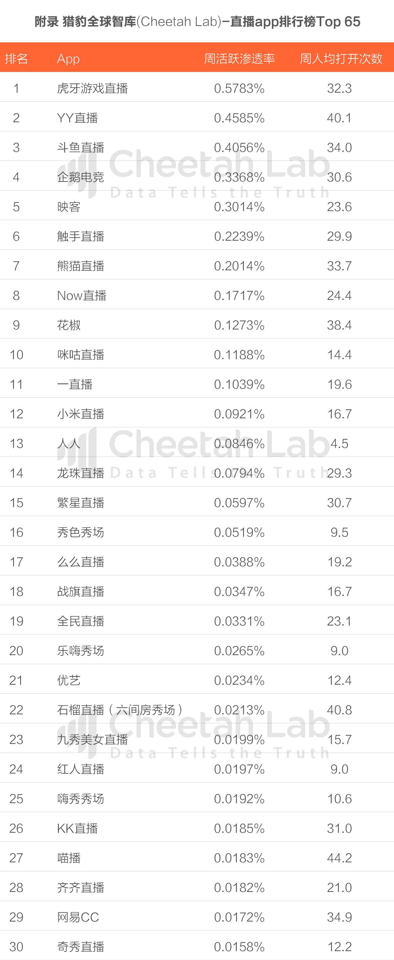 4.猎豹全球智库(Cheetah Lab)的直播排行榜(Top 65完整版在文末)从Top 75减少到Top 65,加上媒体、投融资报道的减少,直播市场归于理性、泡沫减少。